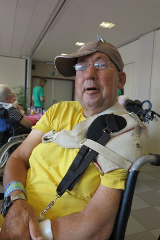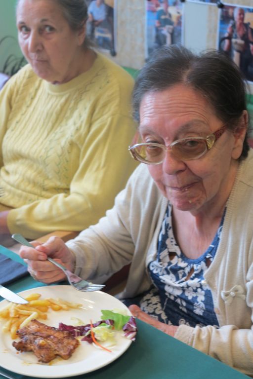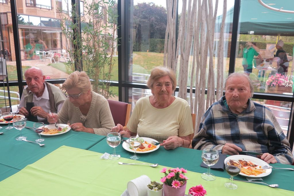De twee barbecuemannen van dienst, Boulil en Tommy, legden verschillende soorten vlees op de barbecue en bakten daarbij frietjes. Als aperitief gingen de vrijwilligers rond met een diverse keuze. Daarbij serveerden we witte pens als hapje. Bij de hoofdmaaltijd maakten we een bord met een slaatje, merguezworst en frietjes. Daarnaast konden de bewoners ook een stuk spek krijgen. We sluiten de maaltijd af met een coup met fruit.